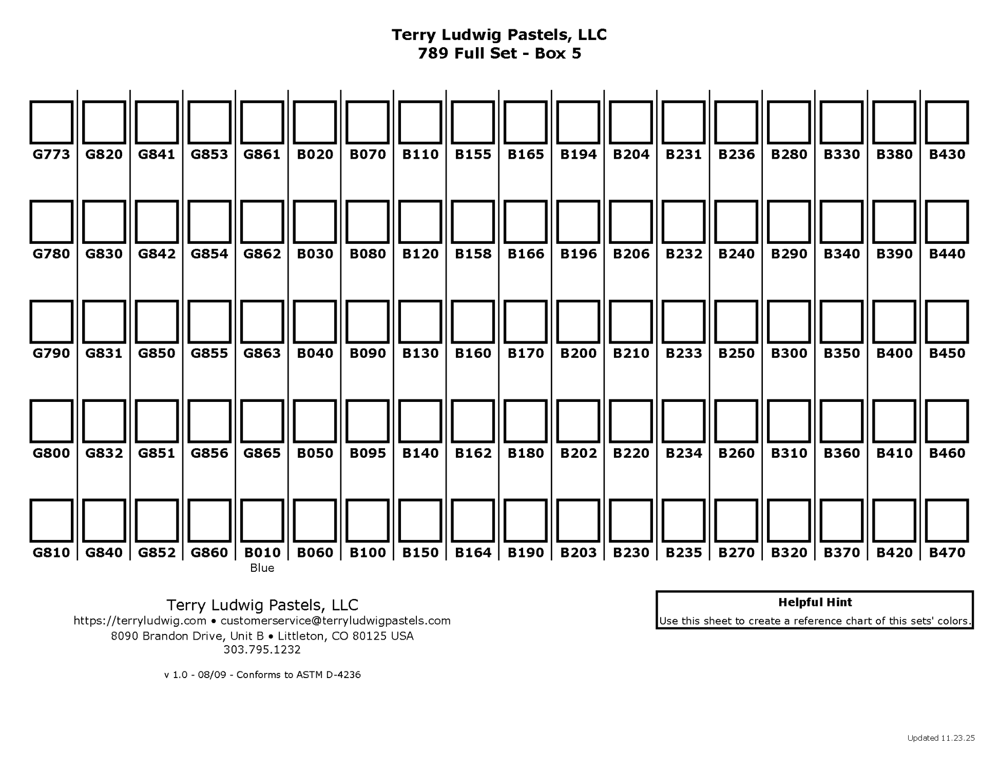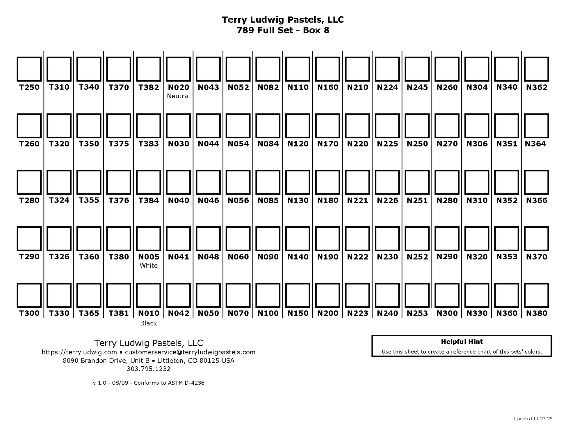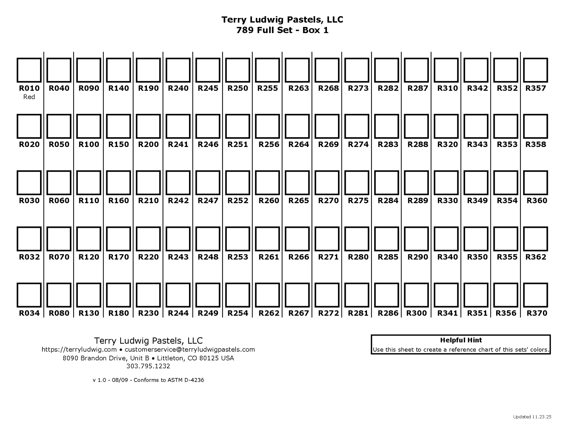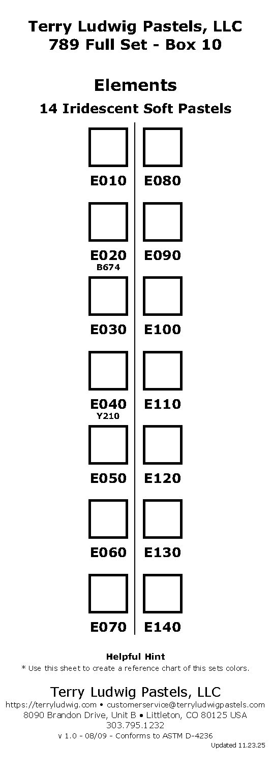Our 789 Full Set offers all of our current colors including the 14 Elements set (iridescents) for purchase in one fell swoop. This beautiful complete ensemble of Terry Ludwig Pastels is made to order and may take up to four to six weeks for delivery. Please contact customerserivce@terryludwigpastels.com for any questions about this set.